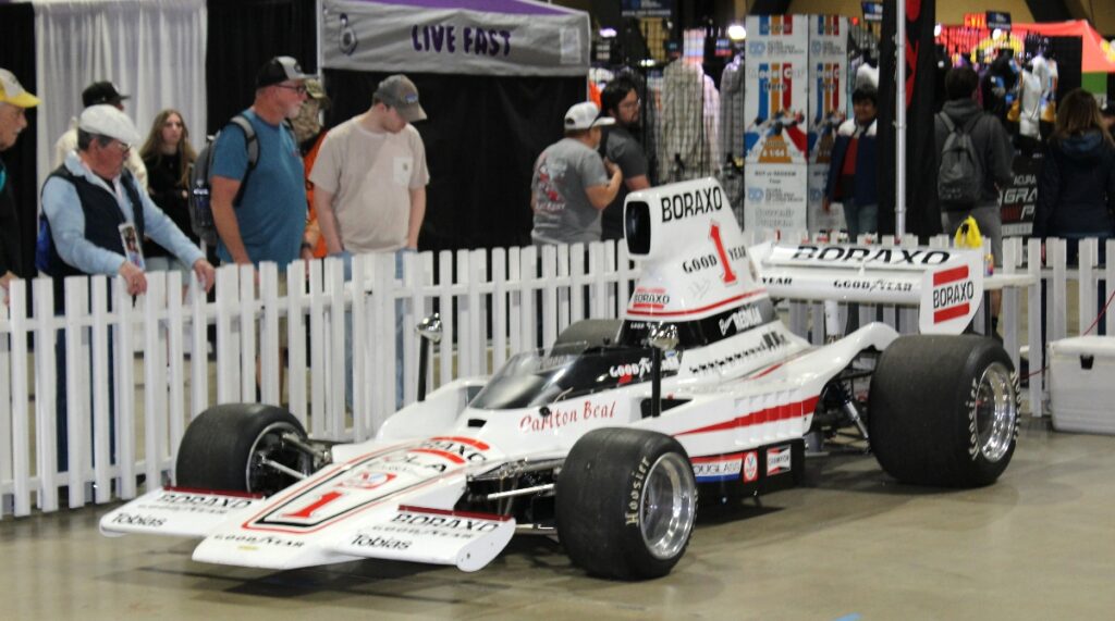 A Brian Redman Boraxo Lola T332 F5000 race car draws a crowd of onlookers in the expo area at the 50th Anniversary of the Grand Prix.