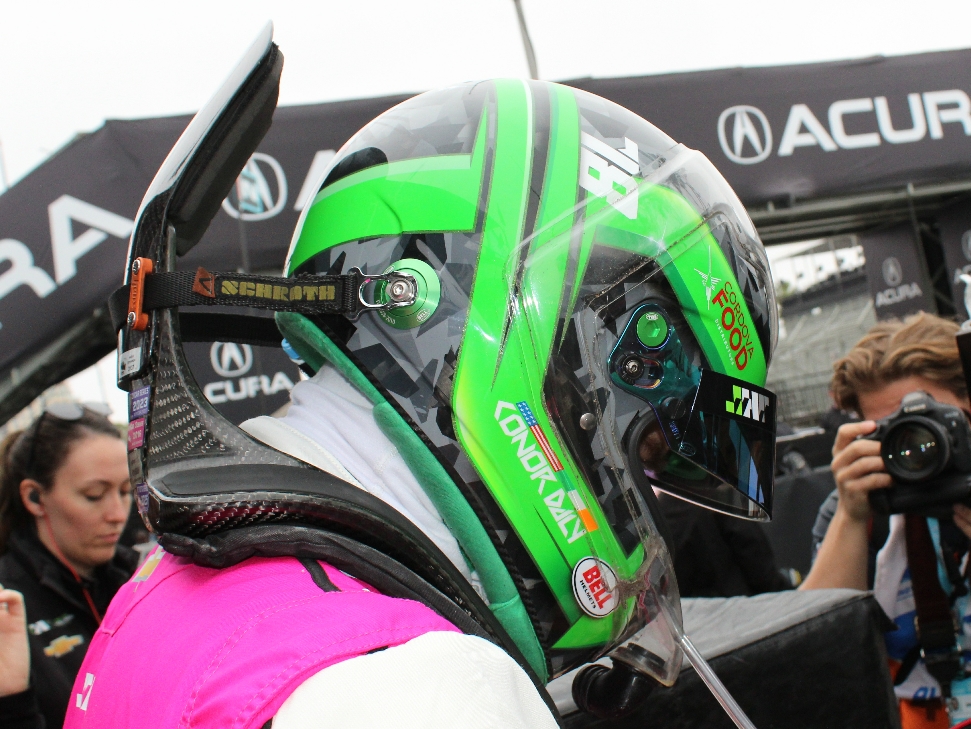 Preparing to enter his race car, Daly has his HANS device fastened to his helmet. Note his forced-air intake in front of his Bell sticker as well as his drink tube.