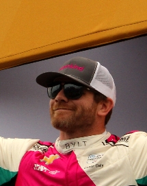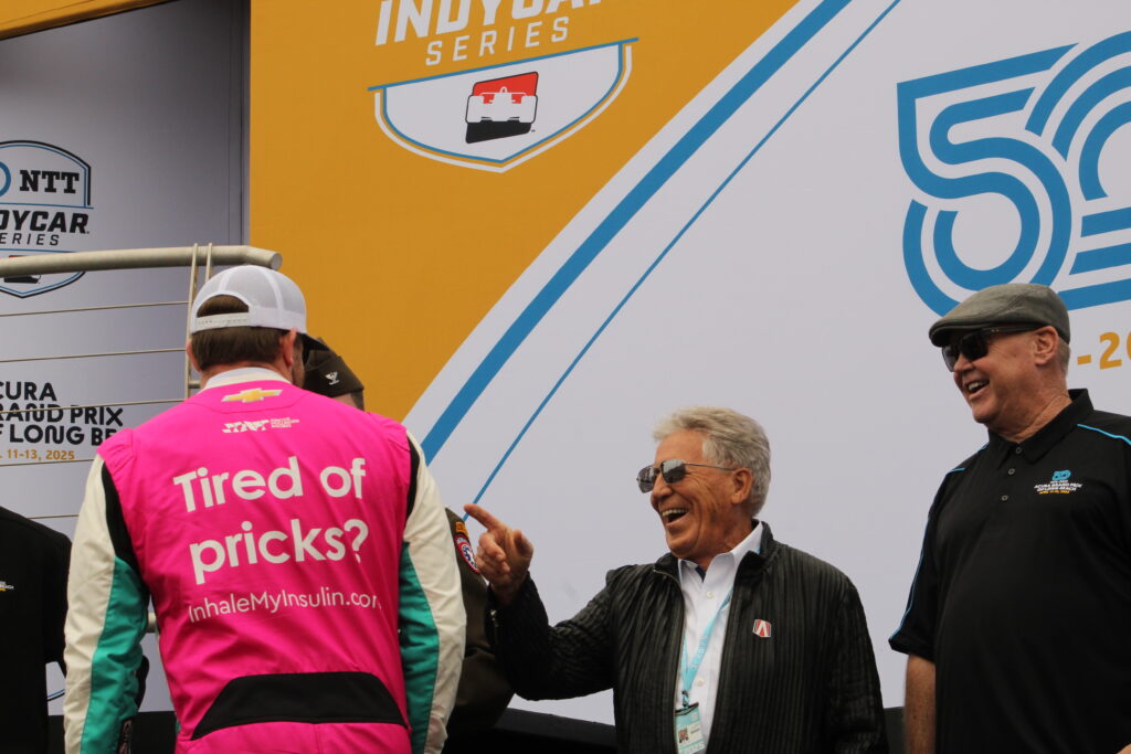 Just after his introduction to the fans, he shares a moment with co-grand marshals, Mario Andretti (M) and Al Unser Jr. (R) who both get a kick and some laughs about his edgy sponsor statement.