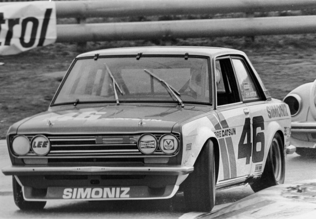 John Morton puts his BRE Datsun 510 through its paces at a wet Laguna Seca in 1972.