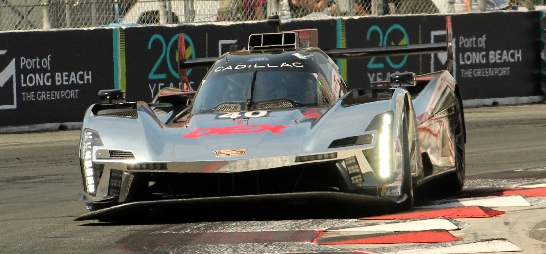 Exiting Turn 10 and entering the hairpin (Turn 11) at Long Beach. Jordan Taylor’s Cadillac leads a trio of world class cars from Aston Martin, BMW and Acura.