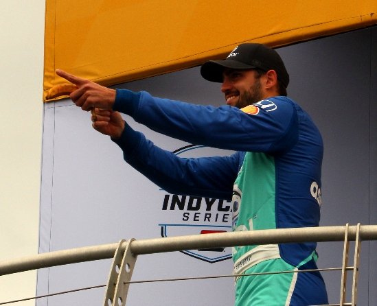Rinus VeeKay points to his fans just prior to the 50th Anniversary of the Acura Grand Prix of Long Beach. Next time, we’ll have to ask him about the banana!