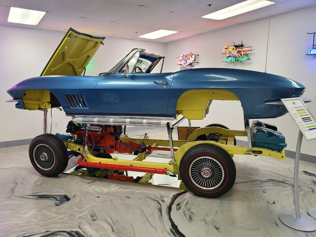 This 1967 Chevrolet Corvette Cutaway is used for educational purposes to show how the body sits on the frame while also highlighting the drivetrain. The transmission in this chassis is the famed, Muncie 4-Speed “rock crusher.” This display allows you to walk 360 degrees around the car and see it inside and out!